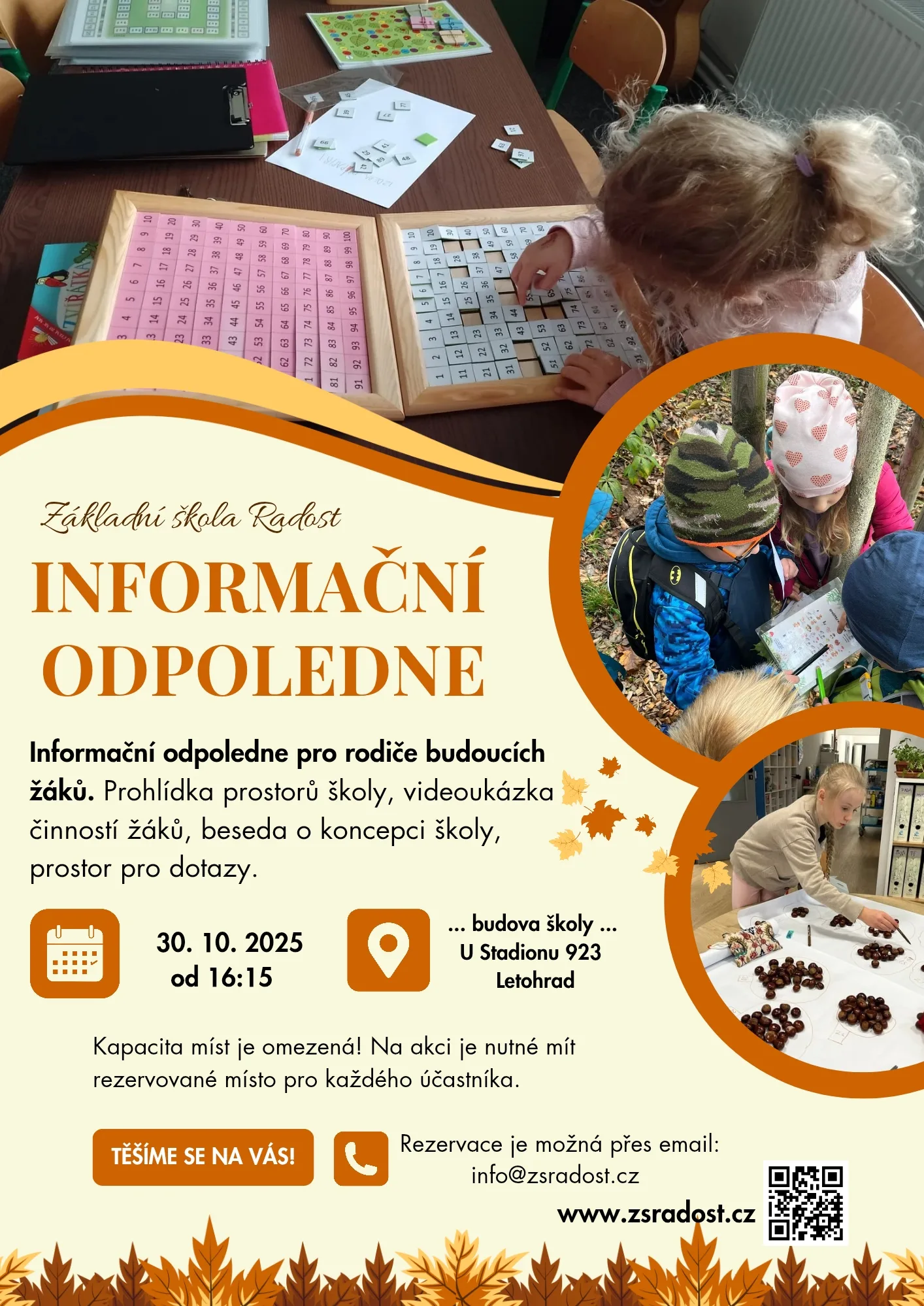 Ve čtvrtek 30. října 2025 od 16:15 hod. proběhne INFORMAČNÍ ODPOLEDNE pro rodiče budoucích žáků. Těšíme se na RADOSTné setkání!
